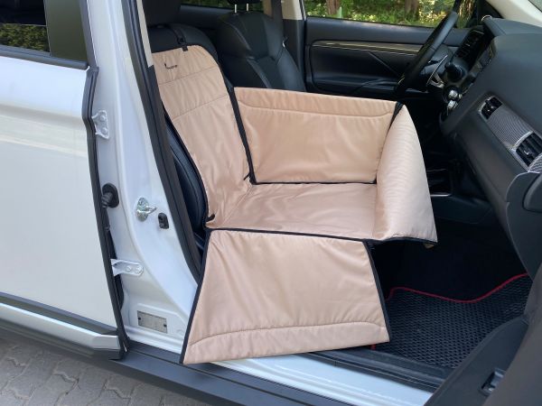 Гамак двусторонний: обе стороны изготовлены из влагостойкой ткани Oxford 600D. Предусмотрено боковые стенки для защиты дверей, и отверстия для фиксации собаки поводком безопасности.