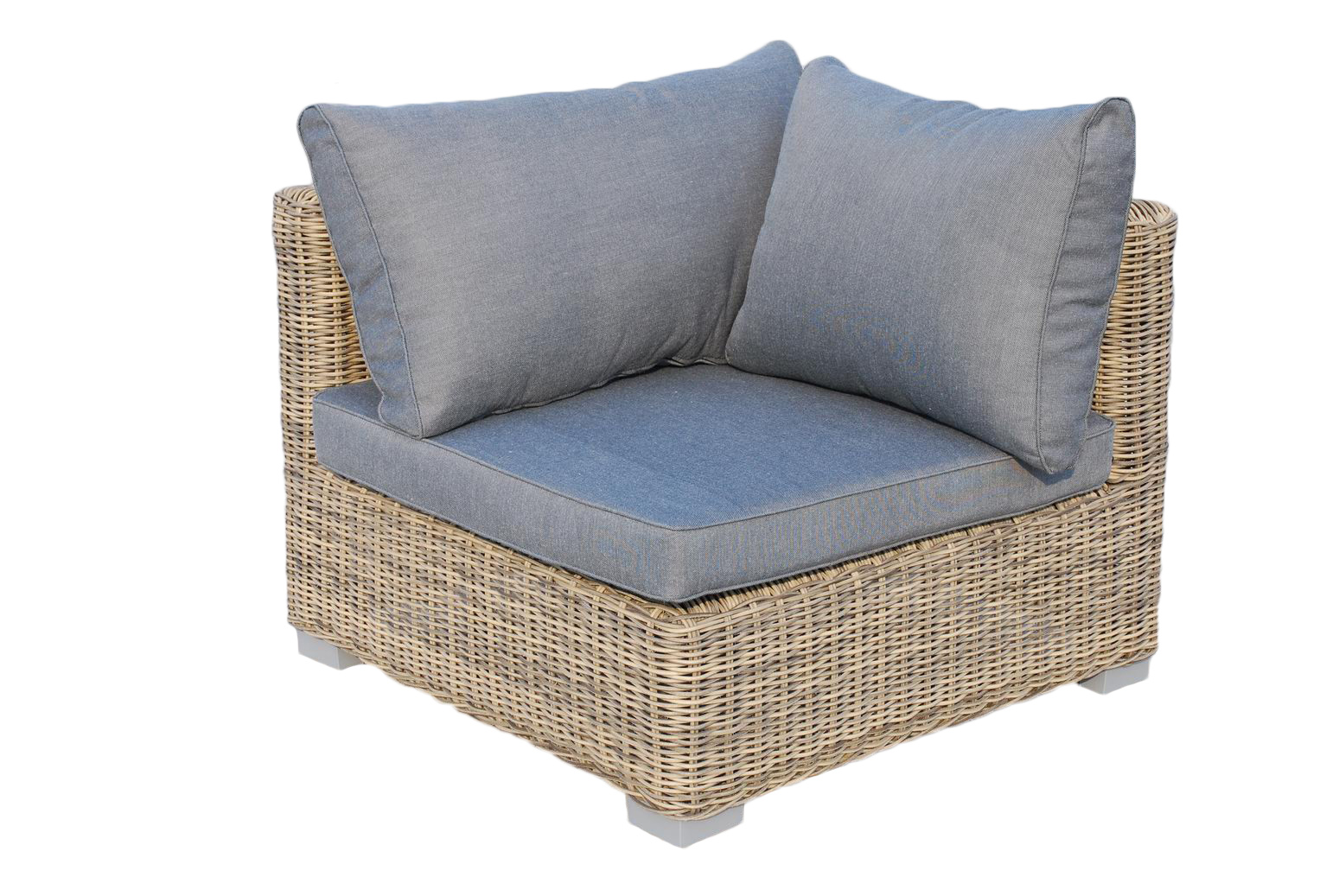 Угловой элемент дивана может выступить в качестве дополнения к дивану и даже в качестве самостоятельной единицы мебели. Элемент изготовлен из алюминиевого каркаса и искусственного ротанга, что позволяет установить его на улице, не боясь за повреждение мебели под воздействием различным температур и погодных условий.