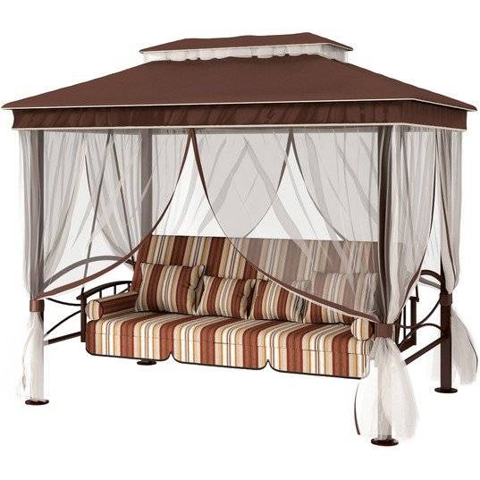 Мы предлагаем вам купить тент для качелей-шатра садовых трехместных Пагода. Выполнен данный тент в коричневом цвете. Подойдёт он тент для размеров изделия 257 х 167 х 243 см. Для изготовления тентов мы использовали материал Оксфорд 240. Это качественный материал, который не пропускает через себя влагу, является устойчивым ко многим воздействиям. Также на верхней части тента располагается специальный клапан с москитной стенкой, который позволяет обеспечить хорошую вентиляцию внутри тента без насекомых или влаги.
