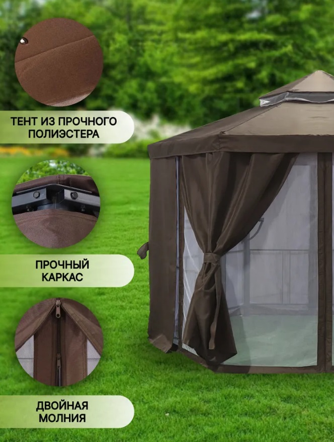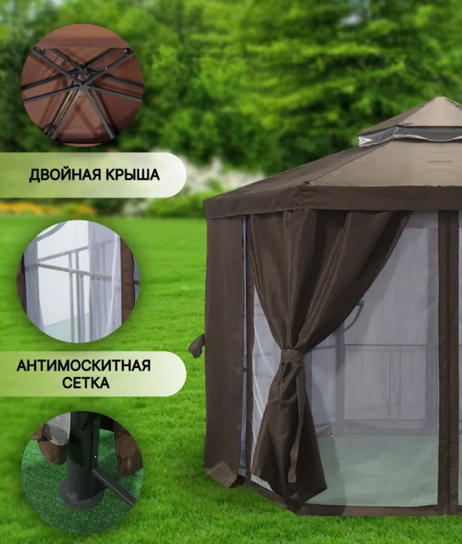 непогоды, тент обеспечивает надежную защиту от дождя, а антимоскитная сетка – от комаров и других насекомых. Этот комплект может быть использован как для нового павильона, так и как запасные части для замены изношенных или поврежденных элементов. Изготовлен из качественных материалов, обладает высокой прочностью и долговечностью. Это надежный выбор для тех, кто ценит комфорт и безопасность во время отдыха на свежем воздухе.